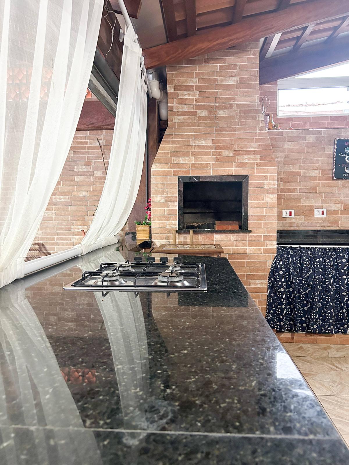 Amplo espaço gourmet com churrasqueira, fogão cooktop, bancadas em granito